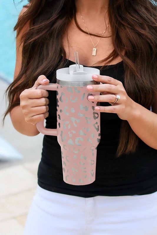Pink 40oz Stainless Steel Portable Leopard Tumbler Mug With Handle