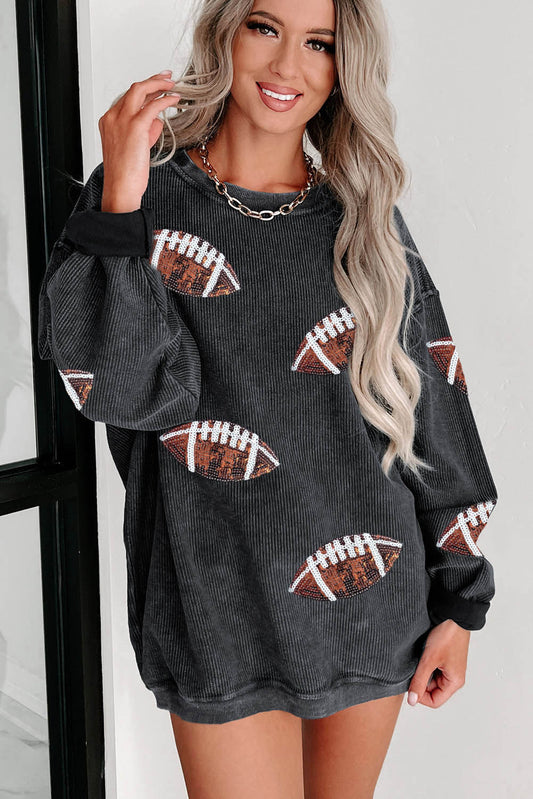 Black Sequin Rugby Graphic Corded Baggy Sweatshirt
