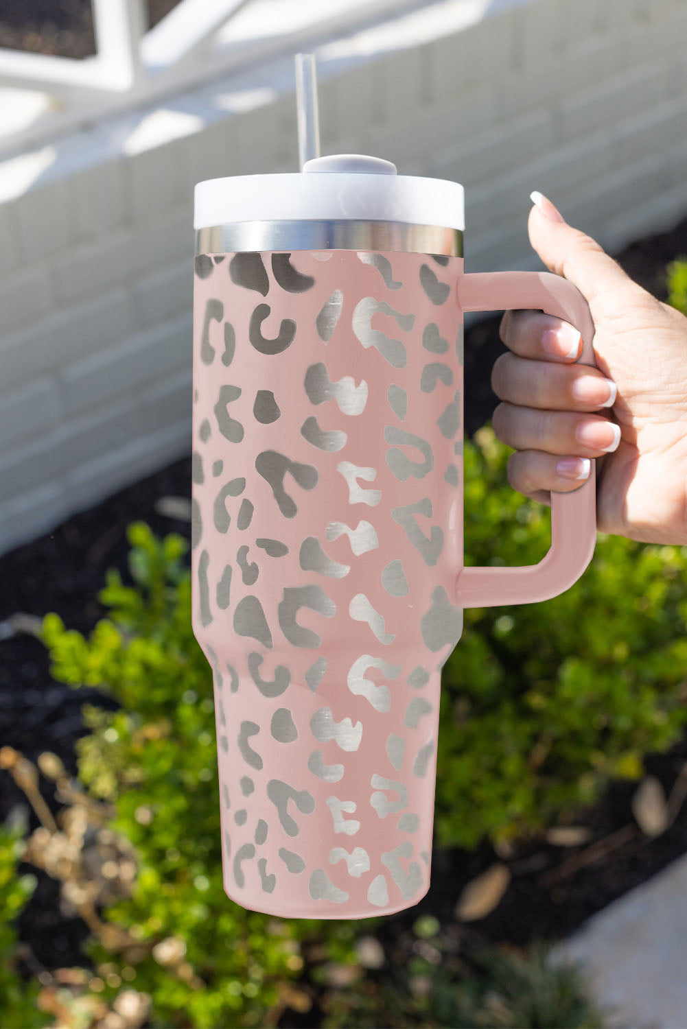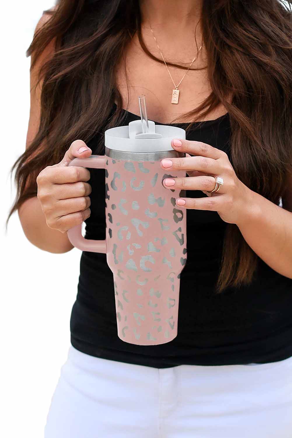 Pink 40oz Stainless Steel Portable Leopard Tumbler Mug With Handle